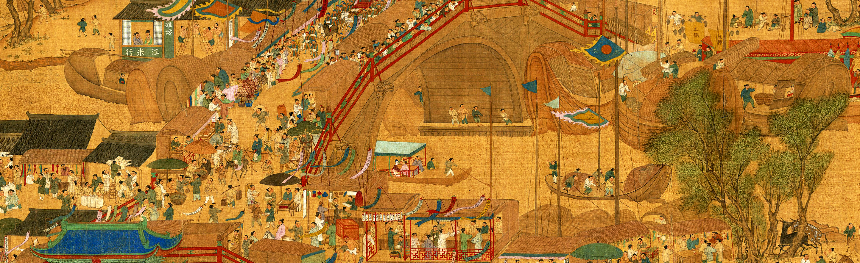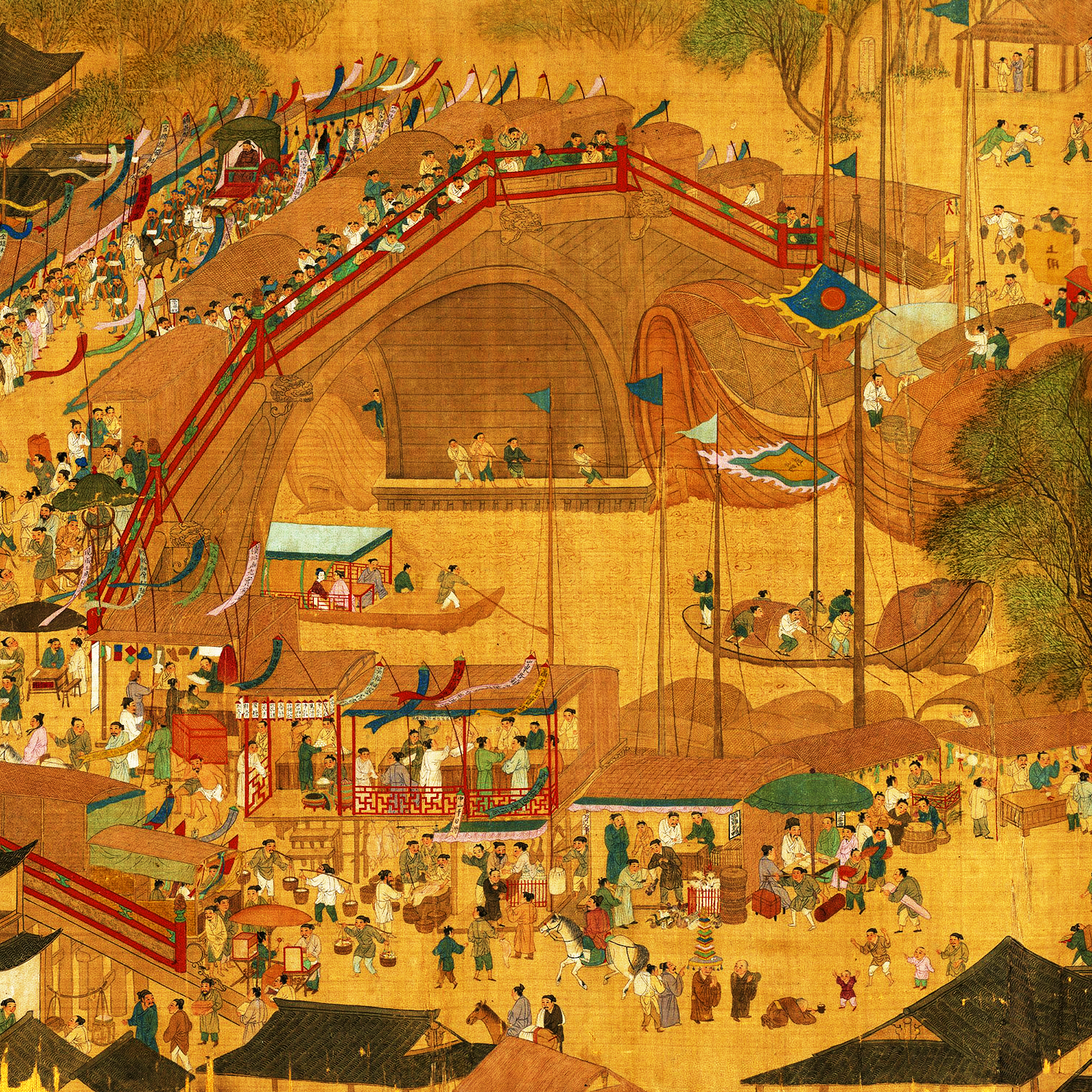 The version here traditionally attributed to Zhang includes such scenes starting from the right as a rustic countryside followed by a colourful bridal procession, the main arched bridge with a market, areas surrounding the city walls, and various bridges and waterfront activities.